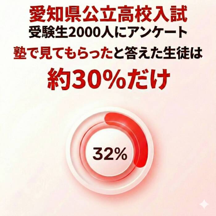 愛知県公立高校入試を受験した2,000人を対象にアンケートを実施したところ、個別指導塾で自分のテスト分析やアドバイスをしっかり受けられた生徒は、30%だけでした 。